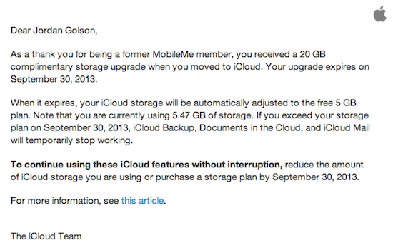 Als Apple im Jahr 2011 iCloud als Nachfolger von MobileMe einführte, erhielten ehemalige Kunden des Vorgängerdienstes für ein Jahr 20 GB zusätzlichen Speicherplatz bei iCloud als Dankeschön für den vorherigen Kauf des kostenpflichtigen MobileMe. Dieser wurde sogar im vergangenen Jahr noch einmal um ein weiteres Jahr verlängert. In diesem Jahr ist nun aber anscheinend endgültig Schluss mit dem kostenlosen Zusatzspeicher für ehemalige MobileMe-Kunden. Apple versendet hierzu aktuell E-Mails an iCloud-Nutzer, deren Speicherbelegung aktuell die kostenlos in iCloud enthaltenen 5 GB Speicher übersteigt. Aus der Mail geht hervor, dass die Herabstufung auf 5 GB mit dem 01. Oktober 2013 in Kraft treten wird. Belegt man zu diesem Zeitpunkt mehr als diese 5 GB, werden Dienste wie iCloud Backup, Dokumente in der Cloud und auch die Mailfunktion von iCloud so lange nicht mehr funktionieren, bis das Problem behoben wurde. Ein bisschen hoffen darf man trotzdem, denn auch im vergangenen Jahr hatte Apple zunächst über das auslaufende Upgrade informiert und dieses anschließend dennoch um ein Jahr verlängert. iCloud-Speicherpläne lassen sich direkt über das iPhone in Stufen von 20 GB (€ 32,- pro Jahr) und 50 GB (€ 80,- pro Jahr) erwerben. Eure aktuelle Belegung könnt ihr ebenfalls direkt auf dem iPhone unter Einstellungen > iCloud > Speicher & Backup in Erfahrung gebracht werden. Auf dem Mac schaut man in den Systemeinstellungen unter dem Punkt iCloud nach. (via MacRumors)