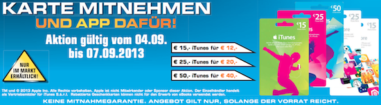 Achtung: Leider kann ich die Hinweise auf die günstigen iTunes-Karten nicht in jedem einzelnen Fall überprüfen. Checkt daher bitte vorher noch einmal ab, ob die jeweilige Filliale den Rabatt auch tatsächlich gewährt!
