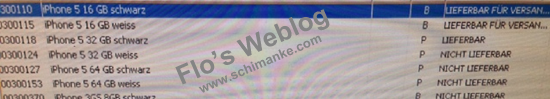 Im Nachgang zu der kürzlichen Nachricht, wonach das Warenwirtschaftssystem des kanadischen Mobilfunkproviders Telus besagt, dass die 32 GB und 64 GB Varianten des iPhone 5 zum 28. September (und damit acht Tage nach dem erwarteten Verkaufsstart von iPhone 5S und iPhone 5C) aus dem Programm genommen werden, erhielt ich aus deutschen Vodafone-Kreisen eine ähnlich lautende Meldung. Auch laut dortigem Warenwirtschaftssystem kann das iPhone 5 nicht mehr in den Größen 32 GB und 64 GB bestellt werden. Das schwarze 32 GB Modell steht nur noch aufgrund von Restverfügbarkeiten am Lager auf "lieferbar".