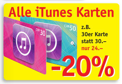 Nachdem ich am Montag bereits auf aktuelle Angebote von iTunes-Geschenkkarten in Deutschland hingewiesen hatte, hier noch ein Nachtrag für alle Leser in der Schweiz. Auch dort gibt es nämlich gute Nachrichten für alle Schnäppchenjäger. So bieten die Filialen der Supermarkt-Kette Spar/Eurospar die Karten aktuell zum Sonderpreis an. Auf alle iTunes-Geschenkkarten gibt es einen Nachlass von 20%. Aber Achtung: Die Aktion gilt nur bis Samstag, den 14. September 2013, bzw. solange der Vorrat reicht. Ebenfalls mit einer Aktion am Start ist der Buchhändler Exlibris. Hier erhält man beim Kauf einer AppStore-Karte mit einem aufgedruckten Wert von CHF 200,- einen satten Nachlass von CHF 80,-. Aber Achtung: Die Aktionen gilt nur am Freitag, den 13. September 2013. Die Anzahl der Karten pro Kauf ist offenbar nicht begrenzt. Man sollte