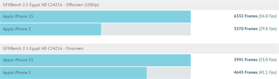 Inzwischen sind auch erste Benchmarks zum iPhone 5S aufgetaucht. Dabei wurden zum Teil dramatische Leistungssteigerungen gegenüber dem iPhone 5 gemessen. So konnte das iPhone 5S Im GFXBench 2.5 Egypt HD Offscreen-Benchmark satte 59 Bilder pro Sekunde berechnen, während das iPhone 5 lediglich auf 29,8 Bilder pro Sekunde kommt. Verzichtet man hingegen auf Full-HD-Qualität, kommt das iPhone 5S auf 53 Bilder pro Sekunde, das iPhone 5 auf 41,4 Bilder pro Sekunde. Die Steigerugen entsprechen dabei 88% bzw. 29%. Allerdings gibt es derzeit noch keine Benchmarks zur Rechenleistung des neuen 64-bit-fähigen A7-Prozessors. Diese dürften allerdings in den kommenden Tagen folgen.