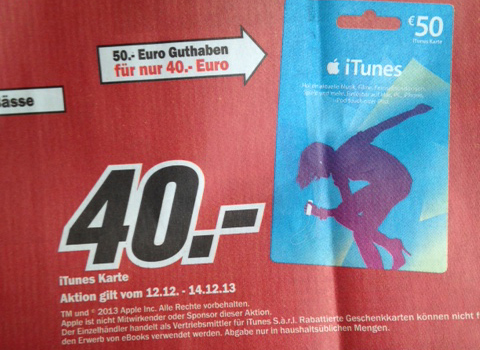 Gestern erst hat Apple seine Set-Tob Box Apple TV neue Kanäle hinzugefügt. Solltet ihr ein solches Gerät noch nicht besitzen, bietet sich aktuell beim Media Markt die Möglichkeit zu einem günstigen Kauf. Sowohl online, als auch in den Märkten selbst kann die aktuelle Version des Apple TV derzeit für gerade einmal € 77,- erworben werden. Zum Vergleich: Apples "Normalpreis" für das Gerät liegt eigentlich bei € 109,-. Und wo wir gerade bei Schnäppchenangeboten im Media Markt sind; beginnend vom heutigen Tag bis einschließlich Samstag erhält man dort die iTunes-Geschenkkarten mit einem aufgedruckten Wert von € 50,- um 20% reduziert. Zuschlagen! (mit Dank an alle Tippgeber und Felix für das unten zu sehende Bild!)