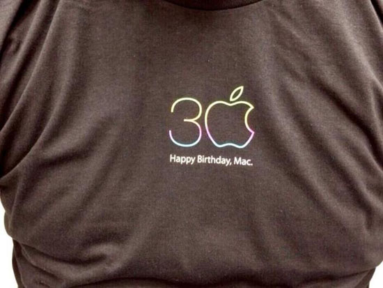 Doch nicht nur online feiert Apple den 30. Geburtstag des Mac. Auch die Apple Retail Stores stehen heute ganz im Zeichen dieses Jubiläums. So präsentieren die Kollegen von 9to5Mac Fotos von einer Schaufenster-Projektion in einem Retail Store. Diese seien auf einer speziellen SD-Karte dorthin verschickt worden. Zudem wurden die Retail-Mitarbeiter mit speziellen T-Shirts ausgestattet.