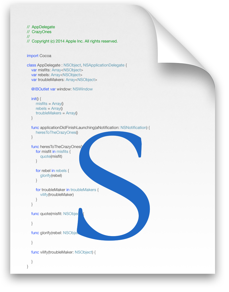 Während immer wieder über die Detailverliebtheit bei Apple gesprochen wird, finde ich es mindestens ebenso spannend, wie akribisch die Apple-Gemeinde nach jedem noch so kleinen Detail Ausschau hält. Beides zusammen genommen führt dann immer wieder zu einem kleinen Lächeln, das einem über das Gesicht huscht, wenn mal wieder etwas entdeckt wurde. Aktuelles Beispiel: Apples neue Programmiersprache Swift. Hiermit wurde natürlich auch eine neue Dateiendung eingeführt, die ebenfalls .swift lautet, sowie ein Symbol für ebensolche Dateien. Und genau hierauf hat ein Twitter-User (via 9to5Mac) eine interessante Entdeckung gemacht. Der bei genauem Hinsehen darauf zu erkennende Quelltext referenziert nämlich den berühmten Text aus Apples "Think Different." Kampagne, "Here's to the crazy ones". So findet man unter anderem Funktionen mit den Namen "heresToTheCrazyOnes" und "villify(troubleMaker: