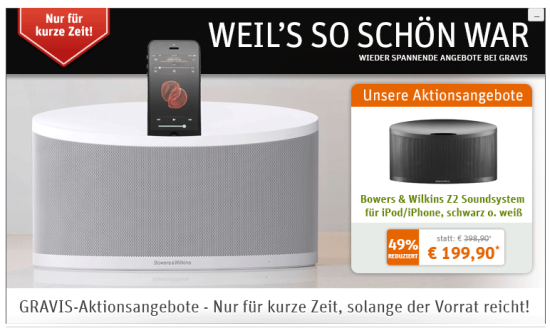 Mal nicht von Amazon, aber dennoch mindestens genauso interessant, gibt es aktuell eine Sonderaktion des Apple Fachhändlers Gravis, bei der ausgewählte Produkte für einen kurzen Zeitraum zu Sonderpreisen abgegeben werden. Unter dem Motto "Weil es so schön war" befindet sich darunter aktuell ein echtes Schnäppchen, welches ich an dieser Stelle meinen Lesern gerne ans Herz legen würde. Es handelt sich dabei um das Soundsystem Z2 von Bowers & Wilkins. Diejenigen, die schon einmal den Sound von Produkten dieser Firma genießen durften wissen, dass es sich dabei um höchste Qualität handelt. Das Z2 verfügt über ein Dock mit Lightning-Connector, kann aber auch drahtlos per AirPlay angestreamt werden. Die Einbindung ins heimische WLAN geht schnell und einfach mit der kostenlosen Bowers & Wilkins Control-App. Normalerweise kostet das gute Stück € 398,90. In der Aktion bei Gravis bekommt man das Z2 aktuell jedoch für günstige € 199,-. Und wer noch Bedarf an weiterem Zubehör hat, wird bei den restlichen sechs Artikeln der Aktion eventuell auch noch fündig. Über den folgenden Link geht es direkt zur Aktionsseite: Gravis