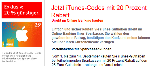 verkaufen. In Deutschland sind es dabei die Filialen der Supermarktketten Müller bei denen man auf alle verfügbaren iTunes- und AppStore-Karten einen Rabatt von 20% erhält. Bei Netto gibt es immerhin 20% Rabatt auf die iTunes-Karten mit einem aufgedruckten Wert von € 25,-. Aber Achtung: Die Aktionen gelten nur bis Samstag, den 06. September 2014 bzw. solange der Vorrat reicht. Bereits seit einiger Zeit bietet auch die Online-Filiale der Sparkasse iTunes-Karten an. Auch dort gibt es nun erstmals einen Rabatt in Höhe von 20% auf die € 25,- Codes. Alle Informationen dazu gibt es hier.
