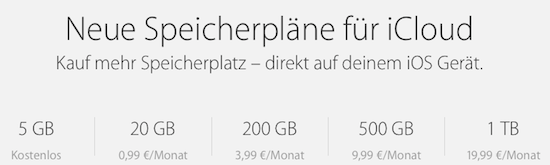 Auf der WWDC hatte Apple angekündigt, dass sich im Herbst die Preise für die verschiedenen Speicherstufen von iCloud ändern und dabei günstiger werden würden. So hatte man damals beispielsweise angegeben, dass 5 GB kostenlos enthalten sind, 20 GB hingegen $ 1,- im Monat kosten würden. Nach dem heutigen Event hat man nun auch die deutschen Preise plus die Preise für die restlichen Speicherstufen auf der iCloud-Webseite bekannt gegeben. Demnach kosten die oben genannten 20 GB hierzulande € 0,99 pro Monat. Zudem lassen sich 200 GB für € 3,99 im Monat, 500 GB für € 9,99 im Monat und 1 TB für € 19,99 im Monat erwerben. Damit entsprechen Apples Abstufungen und Preise ziemlich genau dem, was auch der große Konkurrent Google für seinen Onlinespeicher verlangt.