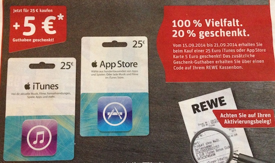 Zu Beginn der Woche gibt es wieder einmal gute Nachrichten für alle Schnäppchenjäger: Es gibt wieder vergünstigte iTunes-Geschenkkarten. Dieses Mal sind es die Filialen der Supermarktkette REWE, die die Karten zum Sonderpreis verkaufen. Dort bekommt man in dieser Woche beim Kauf einer iTunes- oder AppStore-Karte im Wert von € 25,- einen zusätzlichen Gutscheincode im Wert von € 5,- gratis dazu. Dieser erscheint auf dem Kassenbon! Aber Achtung: Die Aktion gilt nur bis Samstag, den 21. September 2014 bzw. solange der Vorrat reicht. Die Filialen des Ecenter bieten darüber hinaus im selben Zeitraum 15% Rabatt auf sämtliche iTunes-Geschenkkarten im Sortiment. Der aufgedruckte Wert der Karten kann sowohl für Musik, als auch für Fernsehserien, Filme und Einkäufe im Mac- und iOS-AppStore genutzt werden. (mit Dank an Uwe!)