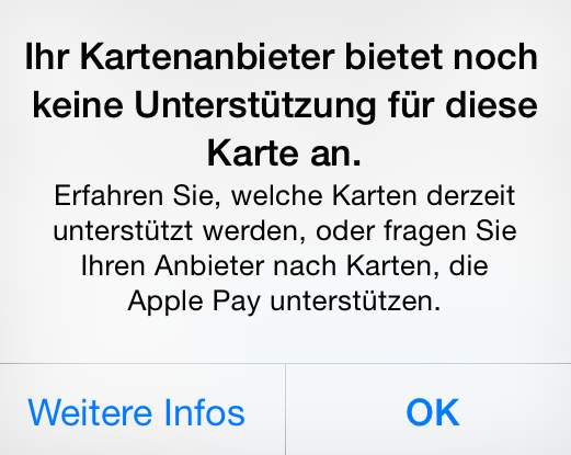 Unklar ist indes nach wie vor, wie Apples Pläne für eine internationale Einführung von Apple Pay aussehen. Während es in Deutschland bereits zarte Anzeichen für entsprechende Pläne gibt, lässt sich unter iOS 8.1 auch bereits das komplett lokalisierte Apple Pay Menü aktivieren. Hierzu ist es lediglich notwendig, unter den Einstellungen die Region auf "Vereinigte Staaten" zu ändern. Auch können hier bereits Kreditkarten über die iPhone-Kamera eingelesen werden. Solange diese aber nicht von einer amerikanischen Bank ausgestellt wurden, wird der Versuch der Aktivierung mit der unten zu sehenden Fehlermeldung quittiert. Eine Einführung in Deutschland bis zum Sommer kommenden Jahres ist aber durchaus realistisch.