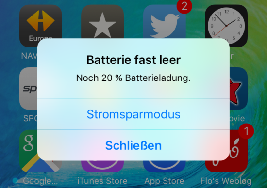 Was hierzu noch fehlt, ist ein entsprechender Button zum Aktivieren des Stromsparmodus im Kontrollzentrum. Dafür werden immerhin nun Informationen zur Akkuladung im Notification Center angezeigt. Zudem kann man den Modus aktivieren, wenn iOS die bekannten Warnungen zur Restlaufzeit bei 20% und 10% anzeigt.