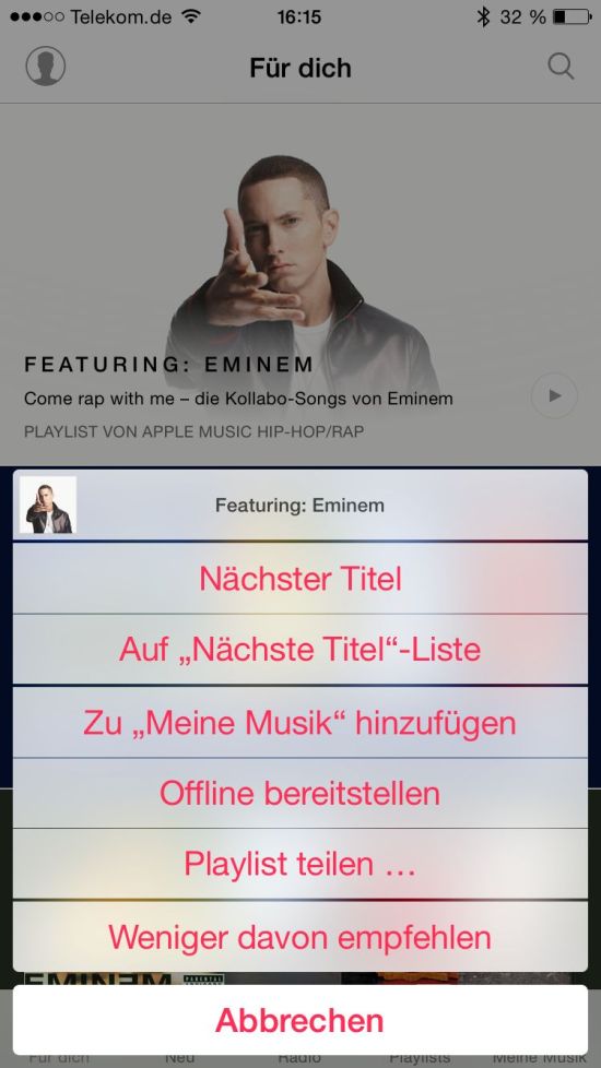 Im Bereich "Für dich" kann man ein Menü aufrufen, wenn man den Finger auf einen der dort zu findenden Einträge gedrückt hält. Unter anderem kann man anschließend hier dann bestimmen, dass man von dem angebotenen Inhalt künftig weniger empfohlen bekommen möchte. Auf diese Weise sollte der Bereich mit der Zeit immer genauer den eigenen Geschmack treffen. Auch das Hören oder Überspringen von Musik wird übrigens registriert und bei den angebotenen Inhalten berücksichtigt. Je mehr man also die Musik-App oder iTunes nutzt, desto genauer wird mit der Zeit der eigene Musikgeschmack getroffen.