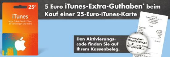 AppStore-Karte mit einem aufgedruckten Wert von € 25,-. Den Code hierfür findet man nach dem Bezahlen auf dem Kassenbon. Aber Achtung: Die Aktion gilt nur bis Samstag, den 25. Juli 2015, bzw. solange der Vorrat reicht. Die Anzahl der Karten pro Kauf ist anscheinend nicht begrenzt. Man sollte also im Zweifel schnell sein, um noch rechtzeitig zuschlagen zu können. Schließlich haben die Karten ja kein Verfallsdatum. Der aufgedruckte Wert der Karten kann sowohl für Musik, als auch für Fernsehserien, Filme und Einkäufe im Mac- und iOS-AppStore genutzt