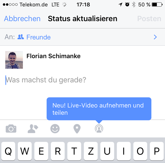 Und auch bei Facebook tut sich etwas. Das bereits seit einigen Wochen in den USA aktive Feature namens Facebook Live wird aktuell auch hierzulande ausgerollt. Hiermit können, ähnlich wie bei Periscope, Live-Videos auf dem eigenen Facebook-Profil über die iOS-App (kostenlos im AppStore) gestreamt werden. Die neue Funktion findet man als Option sobald man ein neues Statusupdate posten möchte, wie auf dem Bild unten zu sehen. Nachdem man hier eine Beschreibung erstellt hat, lässt sich auch noch ein Personenkreis festlegen, welcher das Video sehen darf. Anschließend geht man dann on air.
