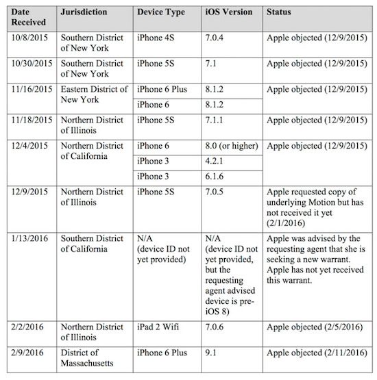 Und auch heute starten wir den Tag wieder mit einem Blick auf die schwelende Auseinandersetzung zwischen Apple und den US-amerikanischen Strafverfolgungsbehörden um die Entschlüsselung eines von Terroristen genutzten iPhone 5c. Wir erinnern uns an den gestern angesprochenen offenen Brief von FBI-Chef James Comey, in dem er ausdrücklich darauf hinweist, dass seine Behörde keineswegs ein Exempel für künftige Strafverfolgungen statuieren möchte, sondern es sich um eine einmalige Angelegenheit handelt. Nur einen Tag später wird diese Aussage bereits ad absurdum geführt. Wie das Wall Street Journal berichtet, hat das U.S. Department of Justice nämlich inzwischen um richterliche Anordnungen gebeten, die Apple dazu zwingen sollen, zwölf weitere iPhones zu entschlüsseln, die bei Straftaten zum Einsatz gekommen sind. Auch hierbei beruft sich die Behörde auf den sogenannten All Writs Act, einem Statut aus dem 18. Jahrhundert. Allerdings handelt es sich dabei um ältere iOS-Versionen. Mit iOS 8 hatte Apple damit begonnen, keine Krytografie-Schlüssel mehr zu speichern und die Daten somit voll und ganz in den Händen der Nutzer zu belassen. Bei mindestens neun der zwölf Forderungen handelt es sich um schwebende Verfahren, wie aus der folgenden Tabelle hervorgeht. (via AppleInsider)