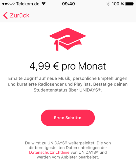 Für die Überprüfung ob man auch tatsächlich Student ist, arbeitet Apple mit dem Anbieter UNiDAY zusammen. Ist man bereits im Besitz eines Abonnements kann man die Umstellung auf den Studenten-Tarif, nach der entsprechenden Überprüfung, in den Einstellungen der Musik-App unter iOS oder online vornehmen.