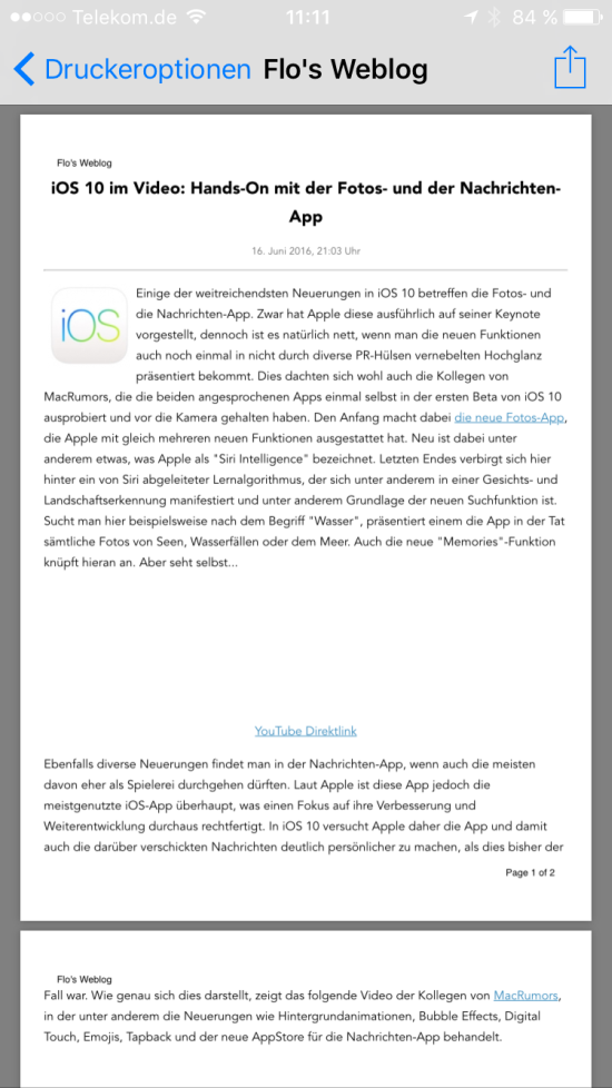 Auf der WWDC-Keynote hat Apple vor allem zehn große und prominente neue Features von iOS 10 in den Vordergrund gestellt. Allerdings findet man immer wieder an jeder kleinen Ecke eine Neuerung, die vielleicht nicht unbedingt bühnentauglich ist, aber dennoch für viele Nutzer einen erheblichen Mehrwert darstellen. Eine dieser kleinen Neuerungen betrifft auch das Drucksystem in iOS. Dieses wird mit Version 10 nun nämlich erstmals in der Lage sein, PDFs aus jedem druckbaren Inhalt erstellen zu können. Hierzu begibt man sich einfach in den Druckdialog des in ein PDF umzuwandelnden Inhalts und führt anschließend auf der Dokumentenvorschau eine Pinch-Geste aus, also dieselbe Geste, die man auch zum Zoomen auf Webseiten oder in Fotos verwendet. Unmittelbar danach steht das Dokument bereits als PDF zur Verfügung, welches dann über das Teilen-Menü an jede App übergeben kann, die PDFs speichert oder weiterverarbeitet.