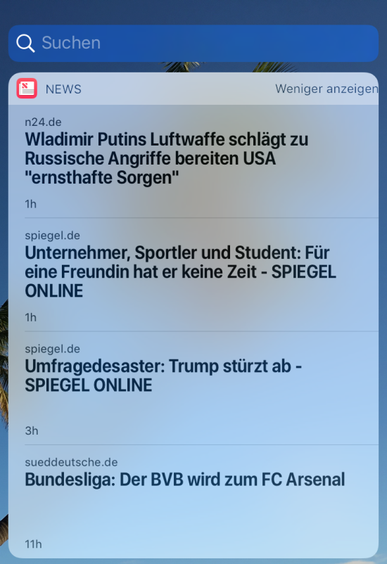 Mit iOS 10 wird es nun nicht nur einige Veränderungen innerhalb der News-App geben (unter anderem werden künftig auch Abonnements hierüber angeboten), es besteht auch die Möglichkeit, dass das Angebot auf weitere Länder ausgedehnt wird. Schaut man einmal in den Widget-Bereich unter iOS 10, findet man hier nun auch in Deutschland bereits erste Inhalte, die unter anderem vom Focus, von N24, dem Spiegel und der Süddeutschen stammen. Aktuell wird die News-App in Deutschland zwar nicht auf dem Homescreen unter iOS 10 angezeigt und ein Tap auf die Einträge im Widget-Bereich leitet aktuell noch auf die jeweilige Webseite weiter. Allerdings scheint sich nun endlich etwas in Sachen Internationalisierung in diesem Bereich zu tun.