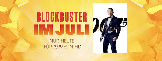 Apple versüßt allen Filmfans den diesjährigen Juli mit einer besonderen Aktion im iTunes Store. Unter dem Motto "Blockbuster im Juli" wird dabei jeden Tag ein neuer Film im iTunes Store für 24 Stunden auf lediglich noch € 3,99 im Preis gesenkt. Hierfür erhält man dann die Kaufversion des Titels in HD-Qualität. Am heutigen Tag handelt es sich dabei um den Bond-Film Skyfall (€ 3,99 bei iTunes). Selbst wenn man aktuell keine Zeit hat, sich den Streifen zu Gemüte zu führen, kann ein Zuschlagen bei diesem Preis nicht schaden. Da es sich um die Kaufversion handelt, kann man den Film nach dem Kauf schauen wann man will und ihn auch jederzeit aus iCloud erneut kostenlos herunterladen. Viel Spaß!