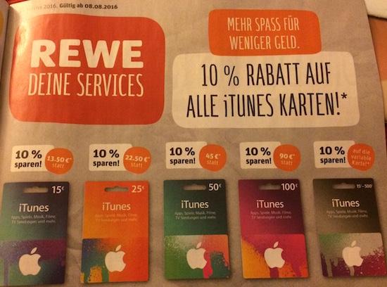 Die neue Woche beginnt mal wieder mit einem interessanten Angebot für alle Schnäppchenjäger: Es gibt wieder vergünstigte iTunes-Geschenkkarten. So sind es dieses Mal die Filialen der Supermarktkette REWE, die die Karten zum Sonderpreis verkaufen. Dort erhält man dabei in dieser Woche einen Rabatt von 10%, auf sämtliche verfügbaren iTunes-Geschenkkarten. Aber Achtung: Die Aktionen gelten nur bis Samstag, den 13. August 2016, bzw. solange der Vorrat reicht. Die Anzahl der Karten pro Kauf ist anscheinend nicht begrenzt. Man sollte also im Zweifel schnell sein, um noch rechtzeitig zuschlagen zu können. Schließlich haben die Karten ja kein Verfallsdatum. Der aufgedruckte Wert der Karten kann sowohl für Musik, als auch für Fernsehserien, Filme und Einkäufe im Mac- und iOS-AppStore genutzt werden. (mit Dank an Uwe!)