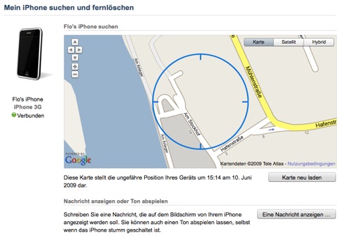 Apples iPhone Software Chef Scott Forstall hatte es auf der Keynote am vergangenen Montag bereits angekündigt. Über die Kombination von iPhone OS 3.0 und MobileMe wird es in Zukunft möglich sein, sein iPhone orten zu lassen und direkt eine Nachricht auf das Gerät zu schicken, um den Finder aufzufordern, das Gerät zurück zu geben. Seit vergangener Nacht können nun Entwickler, die bereits mit dem GM-Build von iPhone OS 3.0 versorgt wurden, dieses Feature live testen. Die Ortung funktioniert natürlich umso besser, wenn man GPS-Signal zur Verfügung hat. Eine an das Gerät gesendete Nachricht wird unmittelbar auf dem Gerät angezeigt und auch der Signalton ertötn, egal ob das iPhone auf stumm geschaltet ist oder nicht. Einen kleinen Haken hat die Geschichte jedoch. Der Datenabgleich im iPhone muss auf "Push" geschaltet sein, sonst findet MobileMe das Gerät nicht.