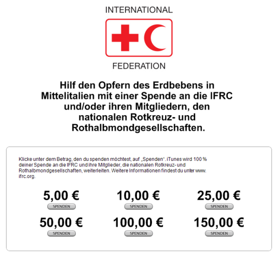 Die meisten werden es in den Medien über die vergangenen Tage verfolgt haben. In Italien hat vor einigen Tagen Erdbeben schwere Verwüstungen angerichtet und mehreren hundert Menschen das Leben gekostet. Weitere mehrere 1.000 Menschen wurden durch das Beben verletzt oder obdachlos. Wie auch schon bei Naturkatastrophen in der Vergangenheit bietet Apple auch dieses Mal wieder eine Sonderseite im iTunes Store an, über die alle User die Möglichkeit haben, Geldbeträge in unterschiedlicher Höhe für die Erdbebenopfer in Mittelitalien zu spenden. Dabei hat man die Wahl zwischen sechs Beträgen zwischen € 5,- und € 150,-, welche dem weltweiten Rotkreuz- und Rothalbmond-Netzwerk in voller Höhe zu Gute kommen. Auch im mobilen iTunes Store ist die Sonderseite verfügbar. Der Kauf einer Spende wird auf der Abrechnung als normale iTunes-Transaktion aufgeführt, eine Spendenquittung also nicht ausgestellt. Dies sollte aus meiner Sicht jedoch nicht davon abhalten, die arg gebeutelten Regionen zumindest mit einem kleinen Betrag zu unterstützen. Ich rufe hiermit alle Besucher und Leser meiner Seite dringend auf, sich an der genannten oder einer anderen Spendenaktion für die Opfer zu beteiligen. Vielen Dank!