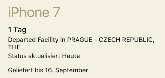Unterdessen erhalten Vorbesteller vom vergangenen Freitag in diesen Stunden die Versandbestätigungen für ihre morgen ankommenden Geräte. In meinem Fall startet mein iPhone 7 in mattschwarz und mit 128 GB seine Reise in Prag und kommt per DHL Express nach Deutschland. Auch UPS ist an der Auslieferung beteiligt.