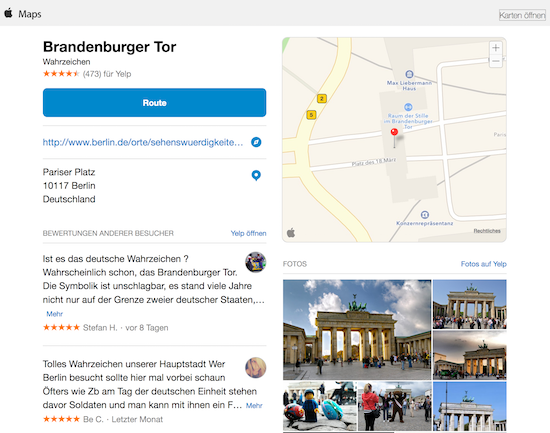 So transportieren einen inzwischen Links die auf einen bestimmten Ort unter maps.apple.com zeigen, nicht mehr zwangsweise in die Karten-App, sondern öffnen Info-Seiten (zumindest am Mac) mit einem zoombaren Kartenausschnitt, Yelp-Rezensionen, Fotos und weiteren Informationen zu dem Ort. Die Kollegen von iFun nennen hier als Beispiel den Apple-Karten-Link zum Brandenburger Tor. Es dürfte also vermutlich nicht mehr lange dauern, ehe Apples Karten den endgültigen Weg ins Web finden.