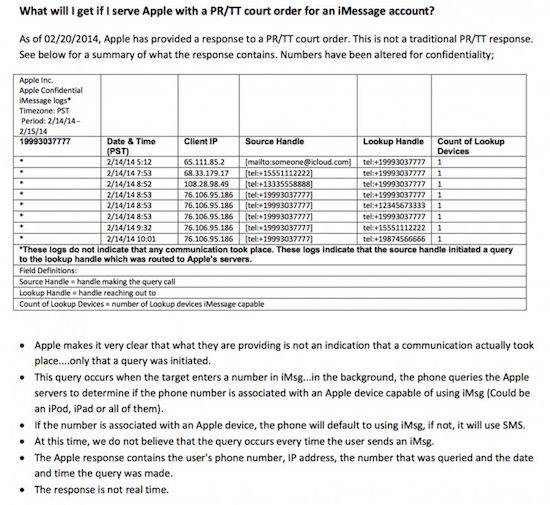 Während die Unterhaltungen innerhalb von iMessage von einer Ende-zu-Ende-Verschlüsselung geschützt sind, die dafür sorgt, dass kein Unbefugter den Inhalt dieser Nachrichten lesen kann, hat The Intercept nun ein Dokument entdeckt, welches zeigt, dass Apple jedoch auf seinen Servern ein Logfile führt, welcher Nutzer mit welchem anderen Nutzer kommuniziert. Im Falle einer richterlichen Anordnung könnte Apple hier auch gezwungen werden, dieses Log auszuhändigen. In technischer Hinsicht ist es so, dass die Nachrichten-App sich beim Versenden einer Nachrichte bei den Apple-Servern meldet, um so in Erfahrung zu bringen, ob der Empfänger iMessage verwendet und die Nachricht entsprechend in diesem Format oder als SMS versendet werden soll. Genau diese Anfragen, inklusive Datum, Uhrzeit, Telefonnummer und IP-Adresse werden von dem angesprochenen Logfile erfasst und laut Apple für 30 Tage gespeichert. Dies hat sich The Intercept aus Cupertino direkt bestätigen lassen. Der folgende Screenshot zeigt einen Ausschnitt der Inhalte des Logfiles.