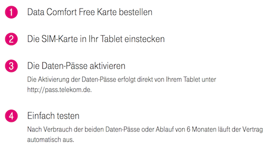 Die wichtigste Information dabei: Man geht nicht das geringste Risiko mit der Buchung ein. Nach Ablauf des Vertrags bedarf es keiner Kündigung. Das Angebot ist komplett kostenlos und es entstehen keinerlei Folgekosten. Kurz nach Abschluss des Vertrags wird die zugehörige reine Daten-SIM verschickt und kommt schon ein paar Tage später an. Wann man die enthaltenen zwei 5 GB Daten-Pässe aktiviert, ist einem selbst überlassen. Die Aktivierung geschieht über die Webseite http://pass.telekom.de, auf der man auch stets den aktuellen Datenverbrauch einsehen kann. Wichtig: Ein Datenpass ist für 30 Tage gültig und nicht verbrauchtes Datenvolumen verfällt im Anschluss. Da es sich um einen reinen Datentarif handelt, der nicht für Telefonie oder SMS genutzt werden kann, eignet sich Data Comfort Free natürlich am ehesten für ein Tablet oder einen Surfstick. (mit Dank an Patrick für den Hinweis!)