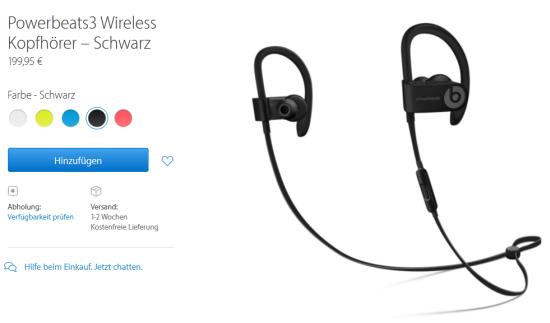 Anlässlich des iPhone-Events im September hatte Apple nicht nur seine neuen AirPods vorgestellt, sondern auch gleich noch neue Kopfhörer aus der hauseigenen Beats-Marke, die ebenfalls mit dem innovativen W1-Chip ausgestattet sind, die ein einfaches und unmittelbares Verbinden via Bluetooth mit einem iPhone oder iPad möglich machen. Während der Sprachgebrauch bislang war, dass die neuen Kopfhörer irgendwann im Laufe des Jahres erhältlich sein werden, lassen sich als erstes Modell die Powerbeats3 Wireless Kopfhörer seit heute über den Apple Online Store bestellen. Apple nennt dabei eine Lieferzeit von "1-2 Wochen". Weiterhin nicht bestellbar sind die ebenfalls angekündigten In-Ear Kopfhörer, bei denen Apple immer noch von einer Verfügbarkeit von "diesen Herbst" spricht.