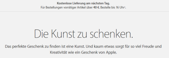 Darüber hinaus bietet Apple bis Weihnachten auch eine kostenlose Expresslieferung an, wenn man Artikel im Wert von über € 40,- bestellt, die Bestellung an Werktagen vor 16:00 Uhr aufgegeben wird und die Artikel vorrätig sind. In diesem Fall wird die Bestellung bereits am nächsten Werktag zugestellt.