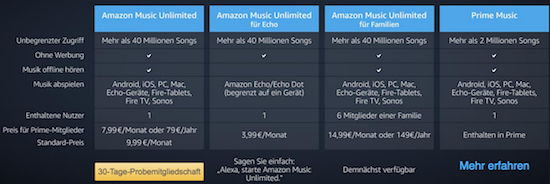 Ansonsten orientiert sich Amazon Music Unlimited im Wesentlichen am Angebot der Konkurrenz. So ist es auch hier möglich, den Dienst 30 Tage lang kostenlos zu testen, sich Musik empfehlen zu lassen oder auch Songs für die Offline-Nutzung herunterzuladen. Zudem gibt es auch hier ein Familienpaket zum Preis von € 14,99 pro Monat bzw. € 149,- im Jahr. Gehört man zun denjenigen, die einen Amazon Echo bestellt haben, gibt es ein weiteres Angebot. Möchte man Amazon Music Unlimited ausschließlich hiermit nutzen, zahlt man monatlich lediglich € 3,99. Für den höheren Preis hat man dagegen auch über die Amazon Music App (kostenlos im AppStore) für iPhone und iPad und vom Rechner aus Zugriff auf den Dienst.
