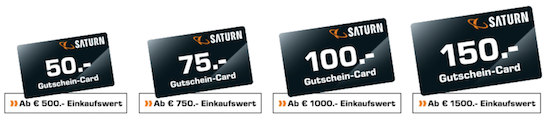 Bei Saturn erhält man während der dortigen Adventswochen hingegen beim Kauf von Apple Produkten je nach Wert eine Saturn-Geschenkkarte in unterschiedlicher Höhe gratis dazu. Dabei gilt, dass man bei einem Bruttoeinkaufswert ab € 500,- eine Geschenkkarte in Höhe von € 50,- erhält. Bei einem Bruttoeinkaufswert ab € 750,- sind es € 75,-, bei einem Bruttoeinkaufswert ab € 1.000,- sind es € 100,- und bei einem Bruttoeinkaufswert ab € 1.500,- € ist es eine Geschenkkarte in Höhe von € 150,-. Der Bruttoeinkaufswert kann sich dabei auch aus mehreren Produkten zusammensetzen. Die Aktion läuft bis zum 24.12.2016. Alle Informationen zu der Aktion gibt es auf einer extra geschalteten Angebotsseite.