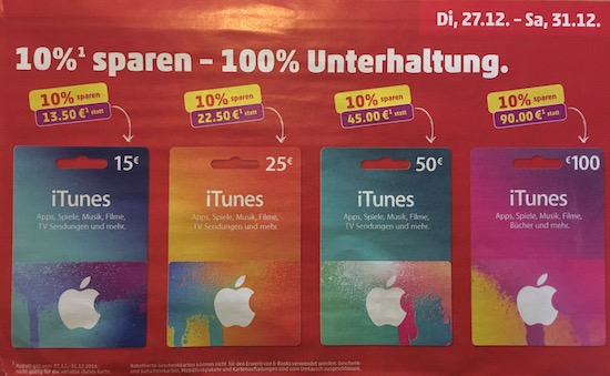 Achtung: Leider kann ich die Hinweise auf die günstigen iTunes-Karten nicht in jedem einzelnen Fall überprüfen. Checkt daher bitte vorher noch einmal ab, ob die jeweilige Filliale den Rabatt auch tatsächlich gewährt!