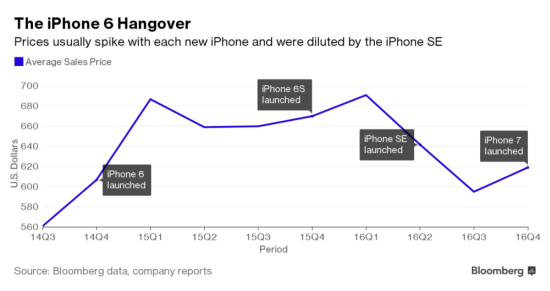 Der Rückgang des durchschnittlichen Verkaufspreises hingegen erklärt sich dem Analysten Mark Moskowitz zufolge vor allem daraus, dass viele Neukäufe auf das ein Jahr alte iPhone 6s entfallen seien. Ihm zufolge haben sich Smartphones inzwischen soweit entwickelt, dass selbst eine ein Jahr alte Version mehr als gut genug für die meisten Nutzer sei. Diese setzen nun vermehrt darauf, dass diese Geräte den digitalen Nutzen bereits erfüllen und so lange genutzt werden, bis dies entweder nicht mehr der Fall ist oder aber das Gerät seinen Geist aufgibt. Darüber hinaus habe aber auch das im vergangenen Jahr auf den Markt gebrachte und überaus erfolgreiche iPhone SE zum geringeren Durchschnittspreis beigetragen, wie unter anderem auch die folgende Grafik zeigt.