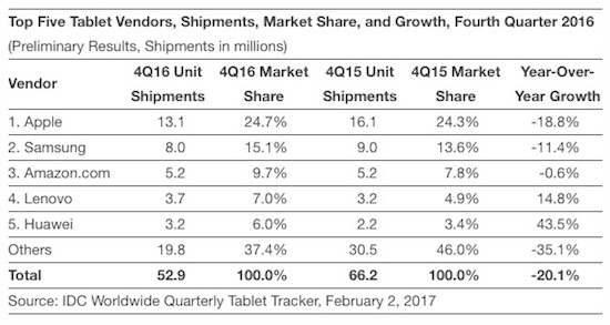 Nicht vergessen darf man dabei natürlich, dass nicht nur Apple unter einem Absatzrückgang in seiner Tabletsparte leidet. Dies trifft auf den gesamten Markt zu, der im genannten Quartal weltweit zwischen 9% und 20% einbrach. Insofern behauptet Apple nach wie vor die Spitze in Sachen Marktanteil. Für die Kunden spielt nach wie vor der Preis eine relativ große Rolle und das iPad gehört hier eher in die High-End Kategorie, wodurch kleinere Hersteller am unteren Ende der Preis- (aber auch der Qualitäts-)Skala aufholen konnten. Hinzu kommt, dass der Updatezyklus bei einem Tablet deutlich länger ist als der bei beispielsweise einem Smartphone. Laut IDC macht daher nicht das iPad Pro den Löwenanteil bei den iPad-Verkäufen aus, sondern nach wie vor das iPad Air 2 und iPad mini. Dass das iPad dennoch im High-End Segment hervoragend da steht, erkennt man auch an Apples Aussage, dass man einen Marktanteil von 85% bei Tablets hält, die mehr als 200 US-Dollar kosten.