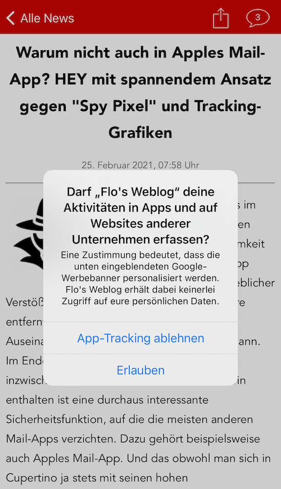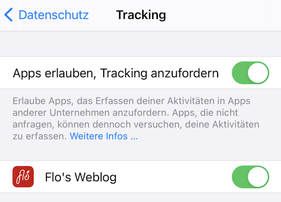 Hierzu möchte ich kurz eine Sache klarstellen, die durch Apples Beschreibungstext innerhalb der Abfrage nicht zu 100% deutlich wird. Wenn dort steht "Darf Flo's Weblog deine Aktivitäten in Apps und auf Websites anderer Unternehmen erfassen" bedeutet dies nicht wie man im ersten Moment denken könnte, dass ich als Entwickler der "Flo's Weblog" App das Tracking vornehme oder Zugriff auf irgendwelche Daten bekomme. Stattdessen gilt dies ausschließlich für Google über die Einbindung des angesprochenen Werbebanners. Ich habe dies durch eine entsprechende Formulierung des Zusatztextes versucht deutlich zu machen.