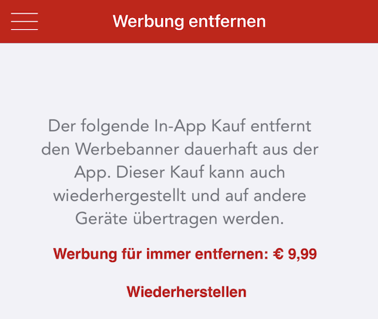 Alternativ könnt ihr natürlich auch (und hierüber freue ich mich natürlich ganz besonders) die Einblendung der Werbung am unteren Bildschirmrand komplett deaktivieren, indem ihr den entsprechenden In-App Kauf für € 9,99 tätigt (zu finden im Menü innerhalb meiner App: "Werbung entfernen") und hiermit den Werbebanner dauerhaft entfernt. Vielen Dank, falls ihr euch für diese Option entscheiden solltet!