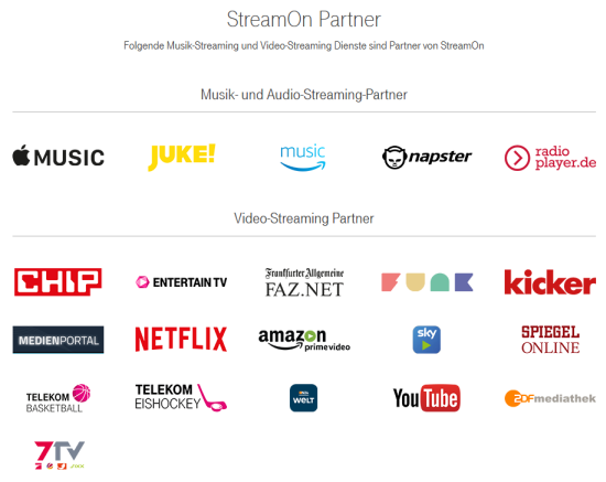 - StreamOn Music&Video ermöglicht im Inland das Audio- und Video-Streaming über teilnehmende Partner (Liste unter www.telekom.de/streamon einsehbar) und nicht teilnehmende Anbieter in mobil-optimierter Übertragungsqualität, vglb. DVD-Qualität.