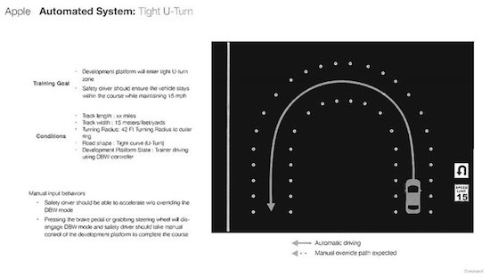 Unter dem Titel "Development Platform Specific Training" verweist das Dokument unter anderem auf ein "Apple Automated System" une eine zugehörige "Development platform", wobei es sich zweifelsohne um die oben angesprochenen Bestrebungen handeln dürfte. Erst kürzlich hatte Apple die Genehmigung der kalifornischen Behörden erhalten, selbstfahrende Autos auf öffentlichen Straßen testen zu dürfen. Das nun durchgesickerte Dokument dürfte dabei Teil des Trainingsprogramms für Mitarbeiter sein, die an dem Projekt beteiligt sind. Den Behörden zufolge soll Apple derzeit drei 2015er Lexus RX450h SUVs testen, die von sechs Fahren pilotiert werden.