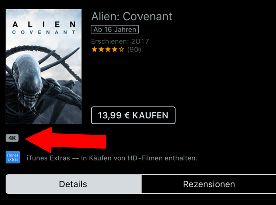 Passend zum heutigen Vorbestellstart des Apple TV 4K hat Apple damit begonnen, die ersten Filme in 4K-Auflösung in den iTunes Store einzupflegen. Aktuell lassen sich diese zwar noch nicht in iTunes am Mac auffinden, greift man aber beispielsweise mit einem iPad auf den Store zu, kann man auch hierzulande bereits den einen oder anderen hochauflösenden Film finden, wie beispielsweise den Neuzugang Alien: Covenant (€ 13,99 bei iTunes). Es darf davon ausgegangen werden, dass das Angebot bis zum offiziellen Verkaufsstart am 22. September (wo verfügbar) nahezu komplett in der neuen Auflösung vorliet.