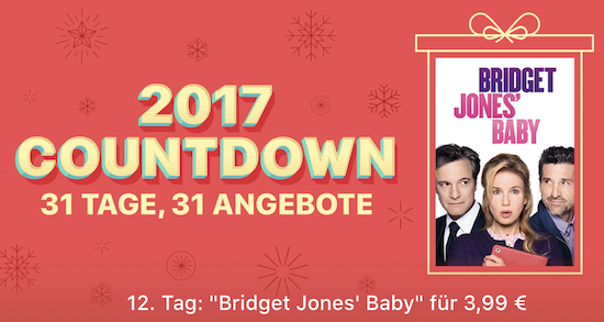 Weihnachten ist die Zeit der Geschenke. Diesem Umstand hat auch Apple in den vergangenen Jahren mit verschiedenen Aktionen im iTunes Store Rechnung getragen. Und so bietet Apple auch in diesem Jahr wieder eine Weihnachtsaktion im iTunes Store an. Dabei erhält man unter dem Motto "2017 Countdown - 31 Tage, 31 Angebote" an jedem der 31 Tage des Dezembers jeweils einen Inhalt aus dem iTunes Store zum vergünstigten Sonderpreis. Heute handelt es sich dabei um die Liebeskomödie Bridget Jones' Baby mit Renée Zellweger, die man für nur € 3,99 in HD-Qualität erwerben kann.