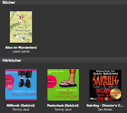 Auch in der Seitenleiste (Mediathek) wurden kleinere Änderungen vorgenommen. Aus "Programme" wurde nun einheitlich in allen Sprachen "Apps" und die Sektion "Hörbücher" wurde nun allgemeiner in "Bücher" umgetauft. Hierin befinden sich künftig sowohl Hörbücher, als auch E-Books, wie der folgende Screenshot zeigt. Wer mag, kann diesen Bereich jetzt schon mit Inhalten befüllen. Hierzu werden die E-Books lediglich im EPUB-Format benötigt. Entsprechende Exemplare können z.B. bei Project Gutenberg kostenlos herunter geladen werden. Öffnen lassen sie sich in iTunes jedoch nicht.