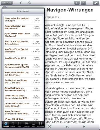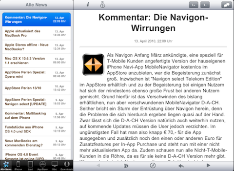 kann kostenlos per Update oder als Neuerwerbung geladen werden. Für alle iPhone und iPod touch Nutzer der App ändert sich durch dieses Update, abgesehen von kleineren Codeverbesserungen, nichts. Dafür wird aus der App nun eine sogenannte "Universal App", also eine App, die sowohl auf dem iPhone und iPod touch auf der einen, als auch auf dem iPad auf der anderen Seite ein eigenes User Interface besitzt (im AppStore an einem kleinen Plus-Zeichen zu erkennen). Wie Apple ankündigte, würde prinzipiell auch die reine iPhone-Version meiner App auf dem iPad laufen. Nach einem Test im iPad-Simulator habe ich mich jedoch dazu entschlossen, ein eigenes User Interface hierfür zu erstellen. Screenshots dazu gibt es weiter unten. An dieser Stelle möchte ich all diejenigen, die bereits im Besitz eines iPads sind dazu aufrufen, mir