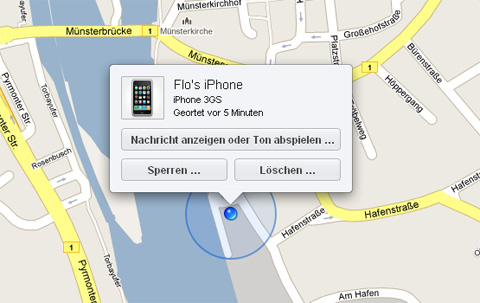 Die iPhone-suchen Web-App rückt verstärkt die Kartenansicht in den Vordergrund, die nach wie vor auf GoogleMaps basiert. Konnte das Gerät geortet werden, stehen einem auch weiterhin die Möglichkeiten zur Anzeige einer Nachricht, zum Abspielen eines Sounds, zur Sperrung und zur kompletten Löschung des Geräts zur Verfügung.