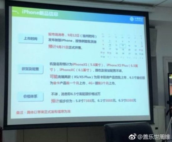 Auf der Folie werden zudem auch die verschiedenen Preise für die unterschiedlichen Modelle genannt. Das "iPhone XS" soll dabei 7.388,- Yuan kosten, was umgerechnet 1.079,- US-Dollar entsprechen würde. Das "iPhone XS Plus" liegt bei 8.388,- Yuan (1.225,- Dollar) und das "iPhone XC" bei 5.888,- Yuan (860,- Dollar). Rechnet man die 17% chinesische Mehrwertsteuer wieder heraus, kämte man auf Preose von ca. 900,- Dollar für das iPhone XS, 1.015,- Dollar für das iPhone XS Plus und 700,- Dollar für das iPhone XC, was in etwa der erwarteten Preisstruktur entsricht.