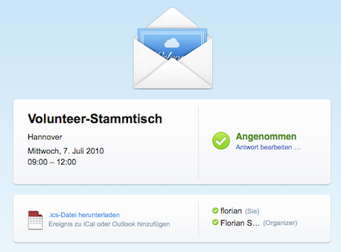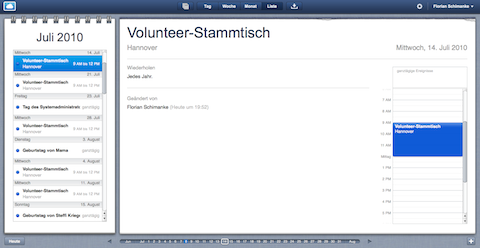 endlich mit anderen Nutzern teilen oder für eine Gruppe oder ein Team freigeben zu können. Erledigt wird dies über den von Dateien auf der iDisk bekannten Share-Button. Klickt man ihn an, kann man den Kalender entweder als "Privaten Kalender" deklarieren und damit nur für bestimmte Personen freigeben, oder als "Öffentlichen Kalender", wodurch er für jedermann einsehbar, aber schreibgeschützt ist. Ebenfalls neu ist die Möglichkeit, Einladungen zu Terminen und Ereignissen an beliebige Adressaten zu versenden. Hierzu gibt man beim jewiligen Termin schlicht die E-Mail Adresse des Teilnehmers ein und speichert ihn. Der Empfänger kann den Termin