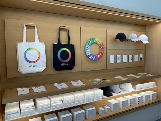Überraschend ist zunächst einmal, wie viele Parkplätze dort für Besucher vorgesehen sind. Allerdings merkt man auch ziemlich schnell, dass diese auch nötig sind. Während einem der Zutritt zum UFO naturgemäß ohne Mitarbeiterausweis verwehrt bleibt, lockt das Besucherzentrum mit großzügigen Flächen, auf denen ein Café, ein AR-gestütztes Modell des Apple Park und ein Apple Store samt Merchandising-Ecke Platz finden. In letzterer findet man dann auch weltweit exklusiv offizielles Apple-Merchandising von T-Shirts über Einkaufstaschen und Caps bis hin zu Memory-Spielen mit Apple-Produktkarten.