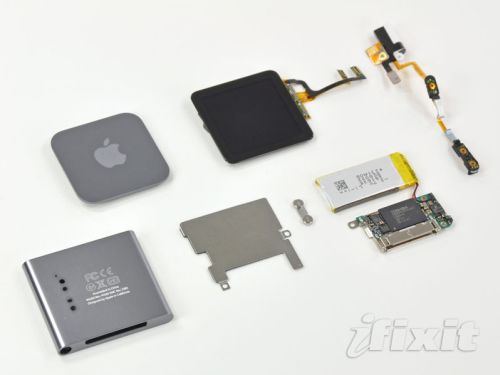 Auch den iPod nano hat man inzwischen einer genaueren Untersuchung unterzogen. Durch den Wegfall des ClickWheels ist das Gerät nun nur noch halb so groß wie sein Vorgänger. Damit entspricht es in etwa den Maßen des neuen iPod shuffle, bietet aber mit 0,39 Wattstunden eine mehr als doppelt so große Kapazität beim Akku. Die Auflösung des Displays beträgt 240 x 240 Pixel, was 220 ppi entspricht (im Vergleich, das iPad hat eine Auflsöung von 132 ppi, iPhone 4 und iPod touch 4G 326 ppi). Ebenso wie bei der Vorgängergeneration nutzt auch der neue iPod nano die Kopfhörer als Antenne für das integrierte FM-Radio. Das Innere wird größtenteils vom Akku und dem Logicboard als Haupt-Hardwarekomponente in Beschlag genommen. Spannend ist aber auch die Frage, was eigentlich auf dieser Hardware für ein Betriebssystem läuft. Optisch erinnert es klar an iOS. Dies ist aber anscheinend nicht der Fall. Steven Troughton-Smith hat sich den Quelltext des OS einmal genauer angeschaut und dabei festgestellt, dass es sich weder um iOS, noch um das alte iPod-OS handelt, sondern offenbar um eine neue, angepasste iOS-Software, die die Versionsnummer 1.0 trägt. Was dem OS im neuen iPod nano im Vergleich zu seinem direkten Vorgänger fehlt, ist die Möglichkeit, Videos wiederzugeben. Es stellt sich aber ohnehin die Frage, ob dies auf dem neuen, kleineren Display überhaupt Sinn machen würde. Nichts desto trotz schein Apple Vorkehrungen für eine solche Funktion getroffen zu haben, wie Codeschnipsel aus dem nano-OS belegen, die Erica Sadun von TUAW ausgegraben hat. Die Möglichkeit, Foto-Diashows zu betrachten, ist hingegen bereits integriert. Mithilfe entweder des Apple Composite-AV-Kabels (€ 49,- im Apple Store) oder des Komponenten-AV-Kabels (€ 49,- im AppleStore) kann man diese Diashows sogar auf einem Fernseher abspielen. Mithilfe von Apples Kopfhörern mit integrierter Fernbedienung und Mikrofon (€ 29,- im Apple Store) kann der iPod nano auch Sprachnotizen im M4A-Format aufzeichnen und anschließend auf einen Rechner übertragen.
