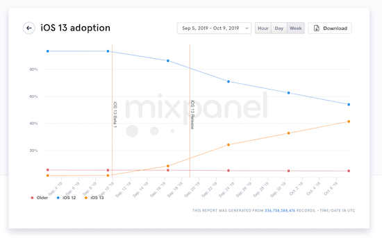 Bislang hat sich Apple nicht offiziell zur Installationsbasis von iOS 13 seit seiner Veröffentlichung vor ziemlich genau drei Wochen geäußert. Ein Umstand, der sich wohl demnächst ändern wird und der unter anderem aber auch mit der eher schleppenden Verbreitung des jüngsten iOS-Updates zusammenhängen mag. Bis zu den ersten offiziellen Zahlen müssen wir uns daher zunächst auf die Zahlen von Analyseportalen wie Mixpanel verlassen, die auf Basis von in verschiedene Apps integrierten Frameworks die Verbreitung zu ermitteln versuchen. eigene Auswertungen an. Demnach kommt iOS 13 aktuell auf eine Verbreitung von ca 40% der aktiv genutzten iOS-Geräte und liegt damit über 10% hinter dem letztjährigen Wert von iOS 12 zum selben Zeitpunkt zurück.